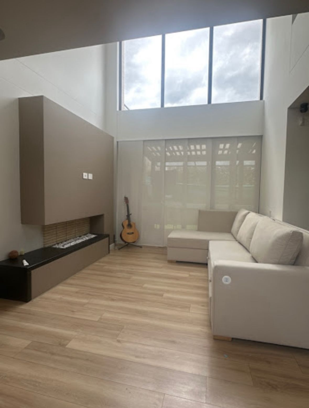 Para la sala, quiero cambiar la forma del muro de la chimenea, quita mucho espacio visual. Quisiera poner decoración tipo escandinava/tradicional.