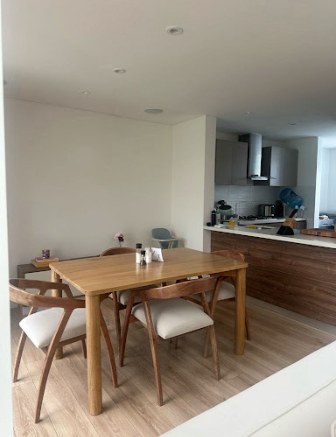 Para el comedor quiero hacer un buffet en la pared del fondo que vaya decoración lado a lado, como en. una imagen que te voy a mostrar en un momento. Quisiera también una lámpara de techo, decorar la mesa, y cambiar el color y textura que está al respaldo de la barra de la cocina