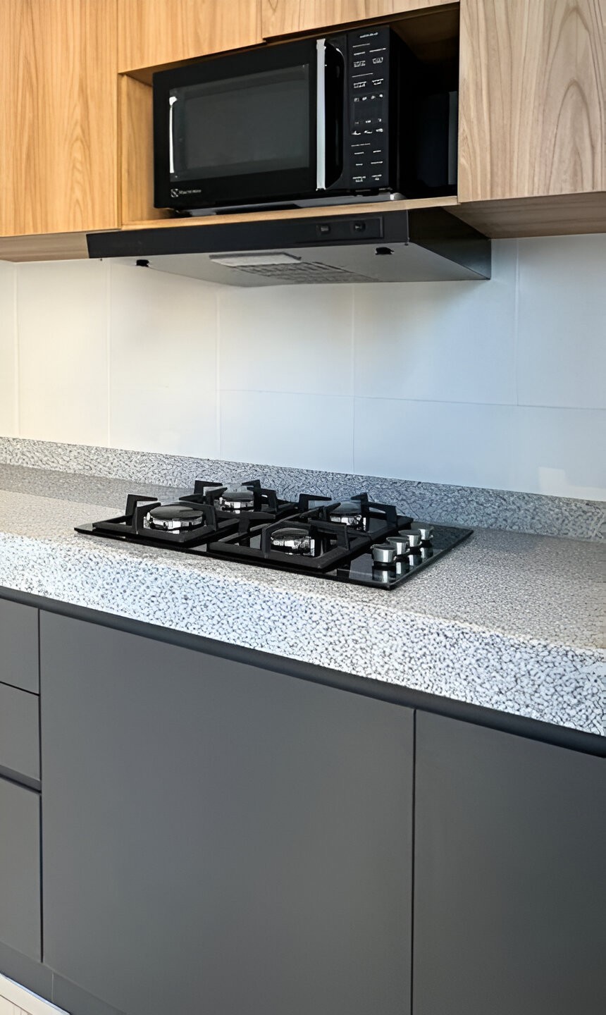 Las superficies lisas y mate aportan un toque de elegancia minimalista, mientras que los detalles en negro y gris añaden un contraste visual que resalta la estética urbana. La elección de materiales y colores subraya un enfoque contemporáneo, con líneas limpias y un diseño funcional que combina lo práctico con lo estético.