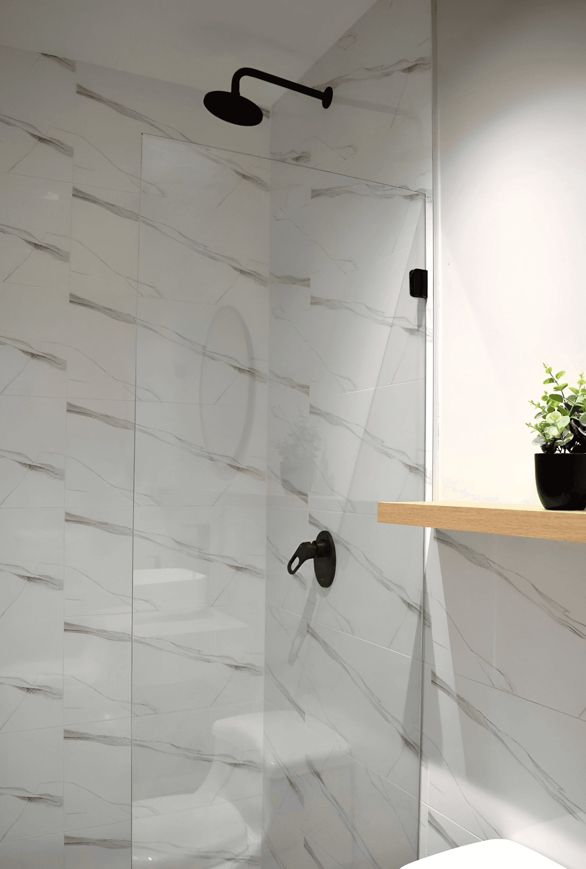 El azulejo cerámico de imitación mármol agrega un toque de sofisticación al espacio sin comprometer el presupuesto, mientras que el lavamanos con superficie de granito blanco con vetas grises aporta textura y un contraste suave. El espejo redondo se convierte en un punto focal que equilibra las líneas rectas del diseño. Un diseño sobrio, limpio y elegante.