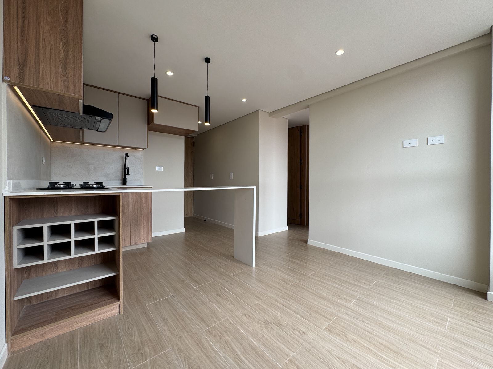 Apto de 32 m2 con una paleta de colores contrastante, en donde la calidez del espacio se mezla con maderas de tonos mas oscuros, se resalta el mobiliario y se mantiene como objetivo preservar la amplitud de los espacios