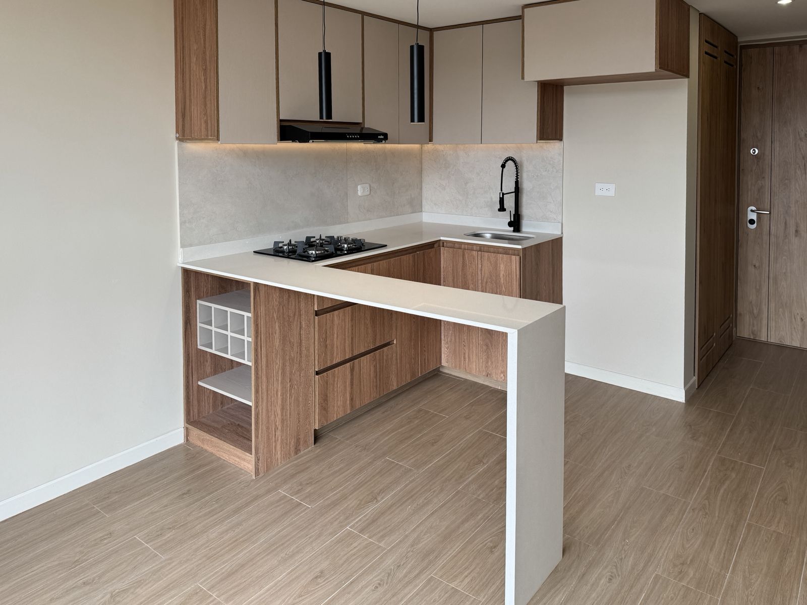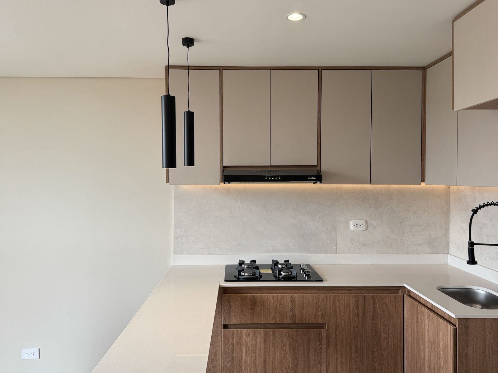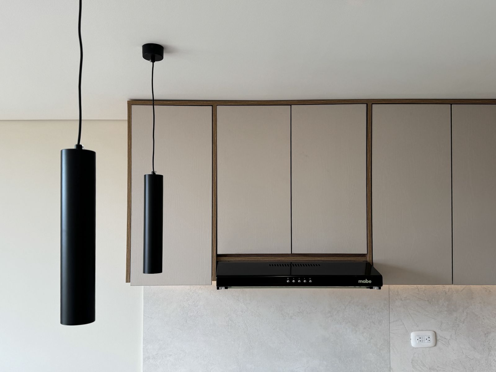 Apto de 32 m2 con una paleta de colores contrastante, en donde la calidez del espacio se mezla con maderas de tonos mas oscuros, se resalta el mobiliario y se mantiene como objetivo preservar la amplitud de los espacios