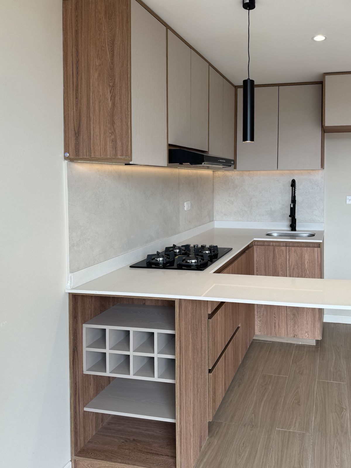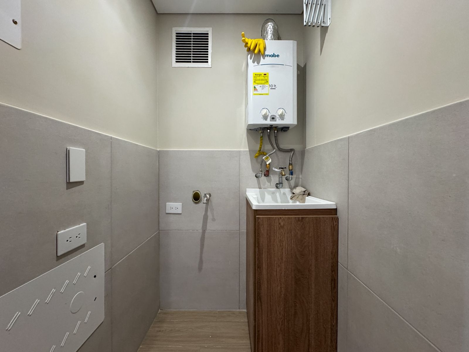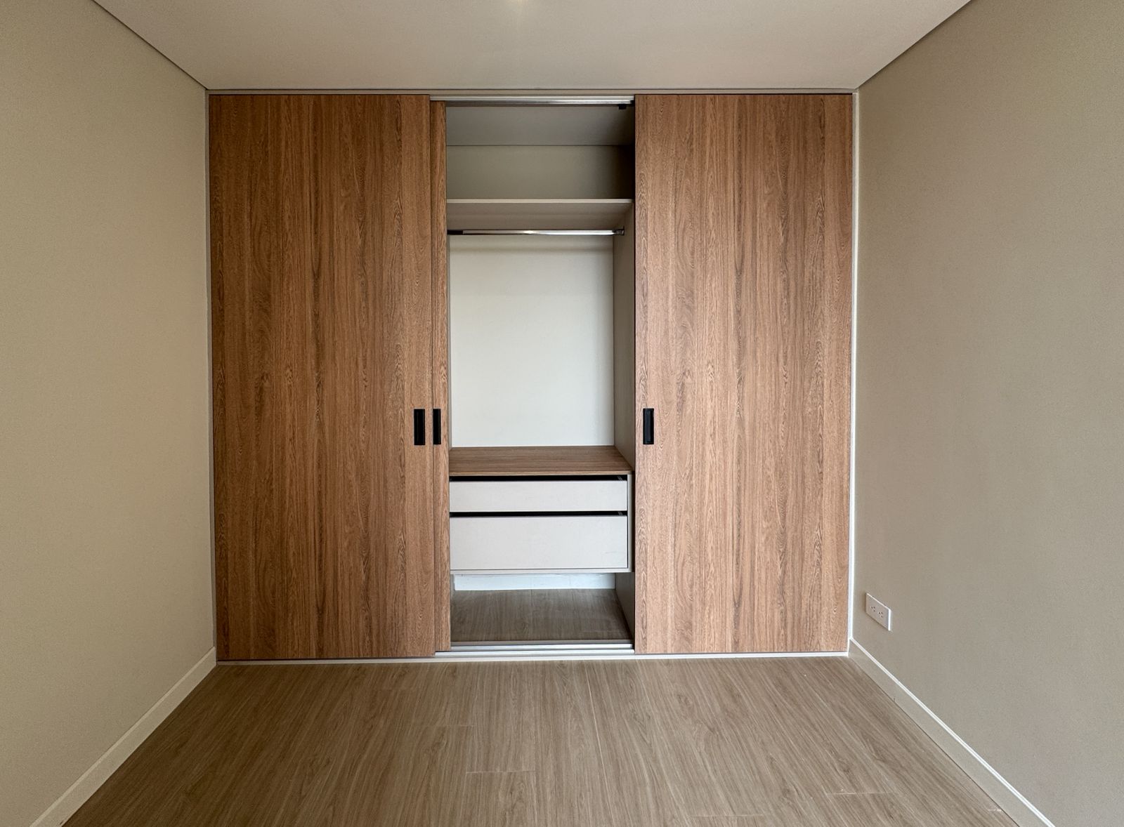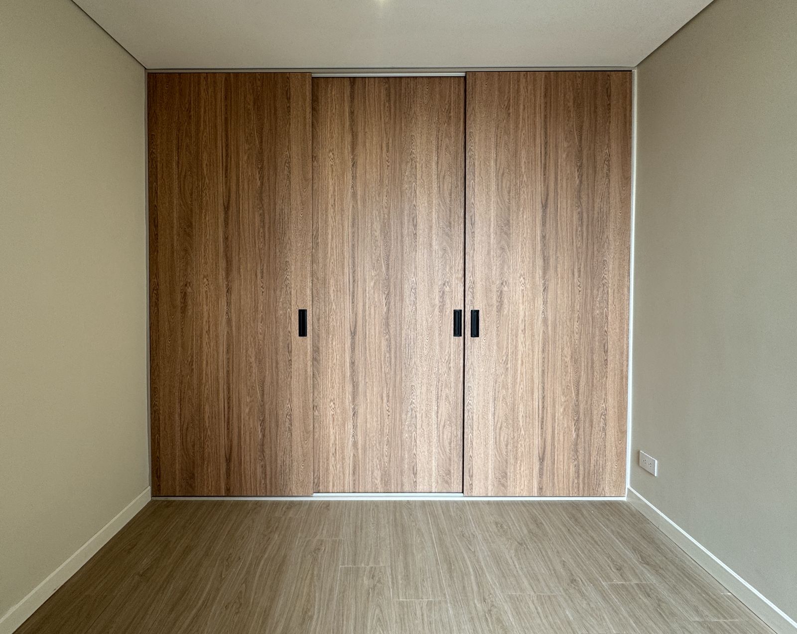 Apto de 32 m2 con una paleta de colores contrastante, en donde la calidez del espacio se mezla con maderas de tonos mas oscuros, se resalta el mobiliario y se mantiene como objetivo preservar la amplitud de los espacios